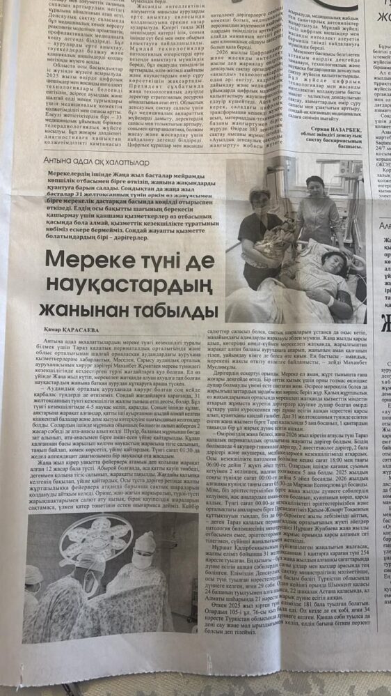 Жаңа жыл мерекесі күндері дәрігерлер үшін демалыс болмайды. Олар барлық мереке түнінде де науқастардың жанынан табылып, адам өмірін сақтап қалу жолында аянбай еңбек етеді. Тараз қалалық перинаталдық орталығы мен аудандық ауруханалардың медицина қызметкерлері де жаңа жылды жұмыс орнында қарсы алды.